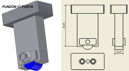Cuando lo tengamos disponible, lo mecanizaremos en la máquina correspondiente (fresadora o limadora), para a continuación, trazar, granetear y taladrar, los dos orificios que roscaremos a M-10/150, y que serán los que mediante dos tornillos Allen, sujeten el punzón al portamachos.