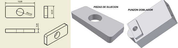 El siguiente paso es mecanizar las dos piezas rectangulares de 45x16x5 mm., con un agujero de 10 mm en el centro, para sujetar el cilindro al punzón, como podemos ver en la siguiente figura